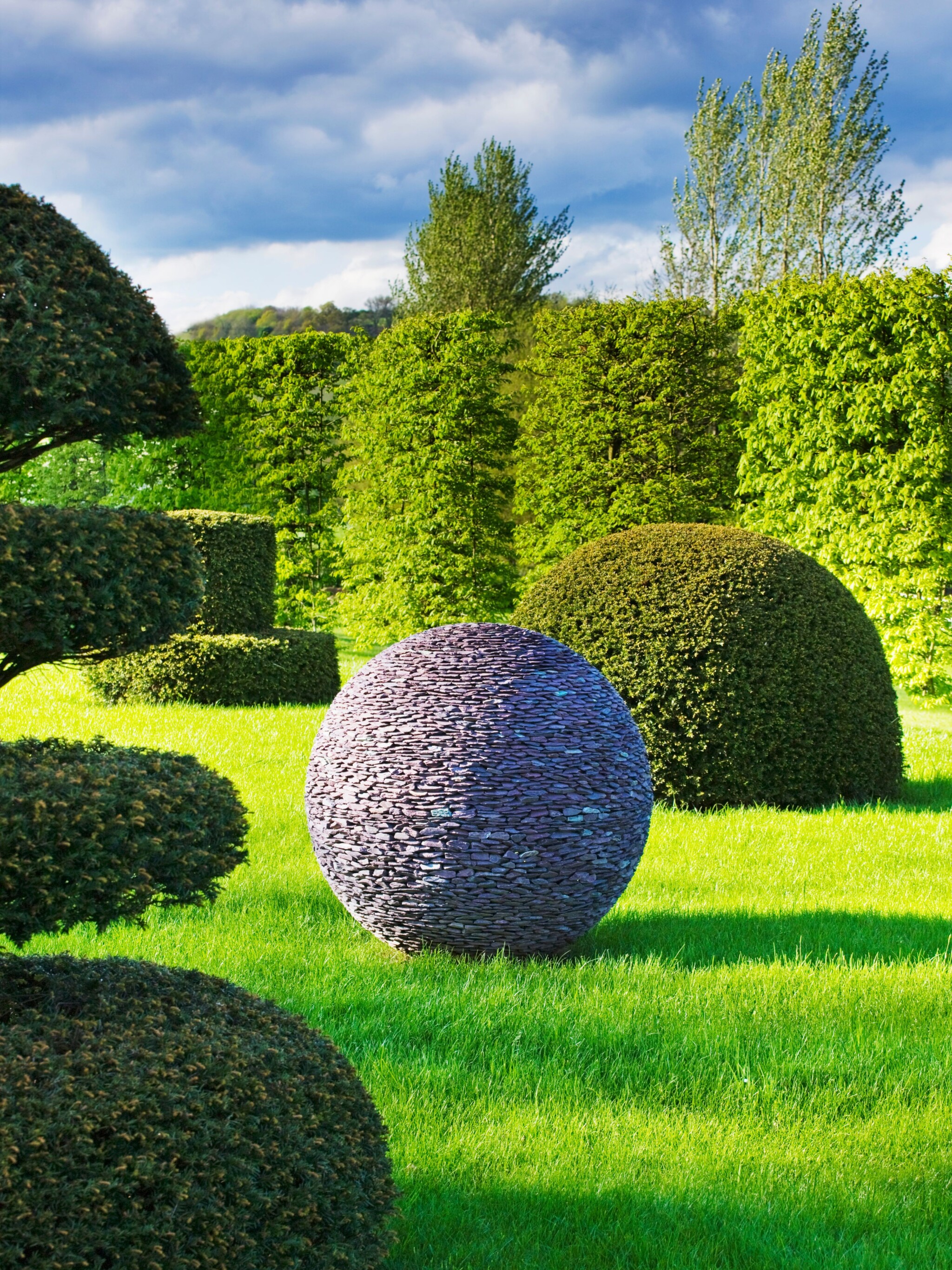 The organic and natural character of slate lends itself to many places within a garden design. It can be used as a charming focal point at the end of a pathway or as garden art within wild, naturalistic planting. Our Dark Planet Fountain sphere sculpture makes for an alluring centrepiece within an existing pond or pool, even more so when raised onto a plinth. The water cascades down the face changing the grey colour of the slate to deep purple.